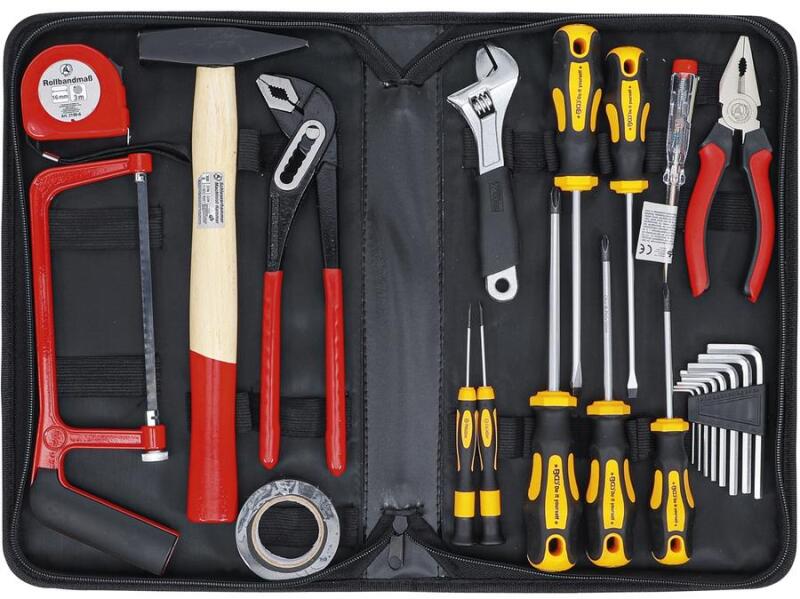 Kiváló minőségű szövetmappában Törés garancia Bruttó súly: 2300 g Készlet tartalma 1 univerzális kézifűrész 150 mm fűrészlappal 1 lakatoskalapács 300 gramm, DIN 1041 1 tekercs PVC-ragasztószalag 1 állítható villáskulcs, 150 mm 1 finommechanikai-csavarhúzó, lapos 2,4 mm 1 finommechanikai-csavarhúzó, Csillag PH 00 2 csavarhúzó, Lapos 5,5 x 125 mm, 6,5 x 125 mm 3 csavarh