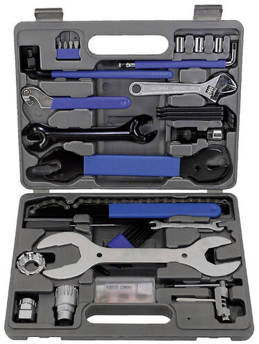 M-Wave szerszámkészlet, 43 db-os, tárolódobozban Gyakorlatilag mindenféle kerékpár szerelési művelet elvégzéséhez szükséges szerszám megtalálható benne: imbusz-szett, láncos kulcs, hajtókar lehúzó, láncbontó, küllőkulcs, állítható monoblokk szerszám, 15/16 és 15/17-es pedálkulcs, acél és műanyag gumileszedők (3 db), kormánycsapágy kontrakulcs, gumijavító szet