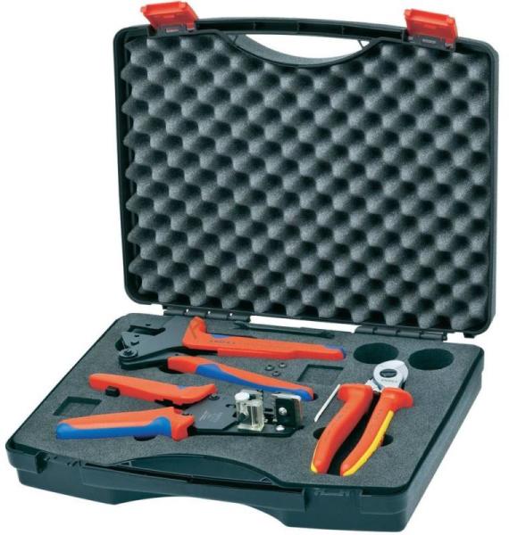 KNIPEX Szolártechnikai szerszám készlet, betétek nélkül 3 részes MC3 műanyag táskában 9791 01. Szolártechnikai szerszám készlet, betétek nélkül, 3 részes, MC3, KNIPEX. Termékinformációk: Szolártechnikai szerszám készlet a napelemes rendszerek összeszereléséhez. Szállítás terjedelme: 1212 11 Precíziós huzalcsupaszító fogó, alakkésekkel, PTFE, szilikon, radox®, ka