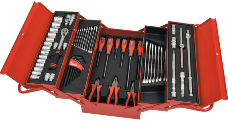 Ötrekeszes, konzolos szerszámosláda speciális öntött tálcákkal, hogy megkönnyítse a szerszámok rendszerezését; furat a lakathoz a további biztonság érdekében. Szerszámosdoboz méretek: 450 x 260 x 200mm. Tartalom: Dugókulcsok: 8-32mm, M10-es és M14-es gyújtógyertyákhoz 250mm-es állítható T-behajtó 125mm és 250 mm-es bővítések, 75mm-es csuklós hosszabbítószár Gyor