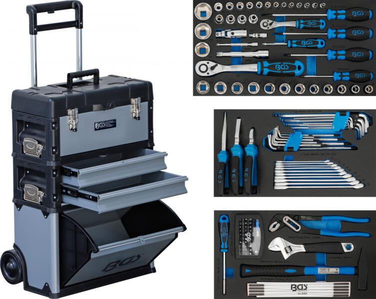 Ütésálló Műanyagból És Acéllemezből Készült Robusztus Keményhéj Tok 3 Szabadon Kombinálható És Egymásra Rakható Részből Áll Multifunkcionális Különböző Tárolási Lehetőségekhez Ideális Összeszerelők, Autószerelők, Villanyszerelők Stb. Számára Az Egyes Szerszámtáska-Tartozékok Két Retesz És Egy Műanyag Hordozófogantyú Segítségével Oldalt Rögzíthető