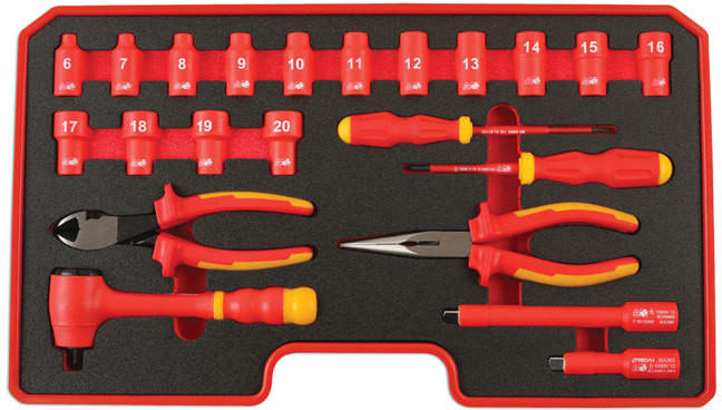 Speciális dugókulcs készlet hibrid autók szereléséhez. Gumis, műanyag védőburkolattal, 1000 V-ig névlegesítve. Elektromos autók szereléséhez elengedhetetlen szerszámkészlet. Meghajtás: 3/8" VDE szabvány /GS megfelelőség. Műanyag kofferben, EVA szivacsos tárolóban. Csomagolási méret: 510 x 320 x 90 mm Súly: 3,515 kg Tartalma: 15 db szigetelt dugókulcs, 46 mm hosszú: 6 /