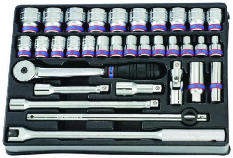 King Tony 1/2" kézi dugókulcs klt jellemzői 33 db-os, 6*, tálcás kivitel (375x265mm) Része a 932-000MR szerszámkocsinak King Tony 1/2˝ kézi dugókulcs klt tartalma 4251 3db hosszabbító: 75, 125, 250mm 4335MR 24db 6* dugófejek: 8, 9, 10, 11, 12, 13, 14, 15, 16, 17, 18, 19, 20, 21, 22, 23, 24, 25, 26, 27, 28, 29, 30, 32mm 4452-15FR 1db hajtószár, flexibilis fejjel: hossz:375mm, súly:7