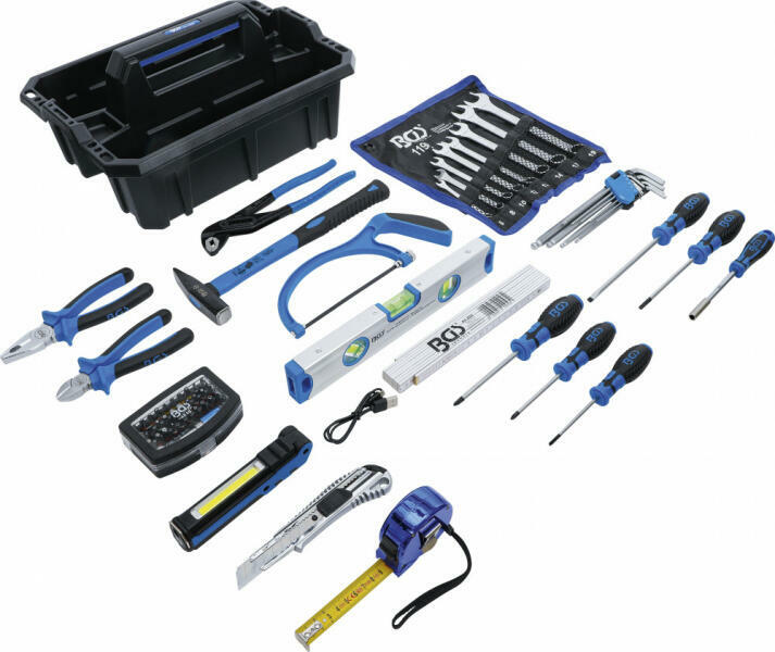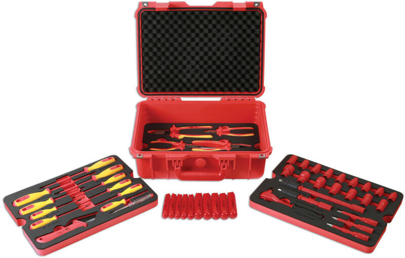 Hibrid autókhoz kialakított speciális szerszám készlet 50 darabos kiszerelésben. VDE 1000 V-os szigetelésű dugókulcs, csavarhúzó és fogó készlet. 1000 V-os tanúsítvánnyal rendelkezik. 3-tálcás kofferben vannak elrendezve a célszerszámok: 1. tálca: 10 darabos csavarhúzó készlet: T20 x 100 mm, T25 x 125 mm, T30 x 150 mm, lapos 2.5 x 75 mm, 3 x 100 mm, 3.5 x 100 mm, 4 x 100 m