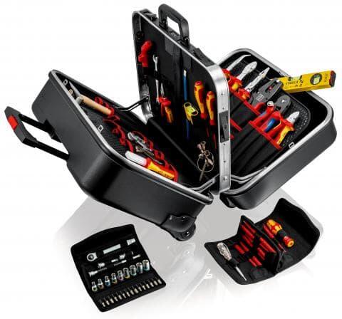 'BIG Twin Move'' Elektro szerszámkoffer 14 KNIPEX szerszámmal, összesen 63 márkás szerszámmal van felszerelve, részben VDE-teszteléssel a DIN EN 60900 szerint. Teleszkópos fogantyú az alapban, valamint két külső, gördülékeny kerék. Szabadon áll minden nyitott helyzetben a bepattintható fedéltartóknak köszönhetően, mindkét oldalán zsanéros mechanizmussal, szabadon állít