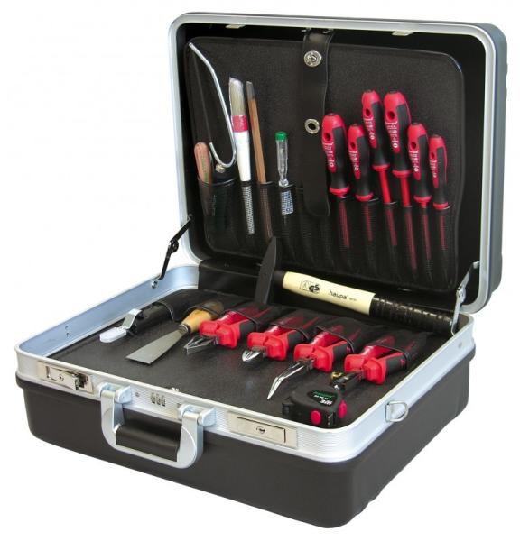 Haupa 220235 Szerszámostáska "Start up VDE" 19 részes Haupa szerszámkoffer „Start-up VDE - 19 részes Kemény koffer, ABS -műanyagból, fekete, 2 szerszámtábla tépőzáras rögzítéssel, számzárral, dokumentációk részére zsebbel, padlórész variálható válaszfalakkal, hord szíjjal, 19 szerszámmal. Koffer 220031. Tartalma: Villanyszerelő csavarhúzó 2K-VDE, 2,5 x 75, 4 x 100