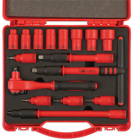 Speciális dugókulcs készlet hibryd autók szereléséhez. Gumis, műanyag védőburkolattal, 1000 V-ig névlegesítve. Elektromos autók szereléséhez elengedhetetlen szerszámkészlet. Meghajtás: 3/8" VDE minősítés / GS megfelelés. Műanyag kofferben és EVA szivacsos tárolóban. Csomagolási méret: 265 x 287 x 57 mm Súly: 2,137 kg Tartalma: 8 db szigetelt dugókulcs: 44 mm hosszú: 8