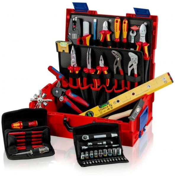 KNIPEX L-BOXX Elektro Robosztus doboz ütésálló ABS műanyagból. 14 KNIPEX szerszámmal, összesen 63 márkás szerszámmal van felszerelve, részben VDE-teszteléssel a DIN EN 60900 szerint. Max. hasznos teherbírás: 25 kg. Fröccsenő víz ellen védett. Több doboz megbízhatóan összekapcsolható. Rugalmas belső felosztás. A fogantyú helytakarékossági okokból a fedélben találhat