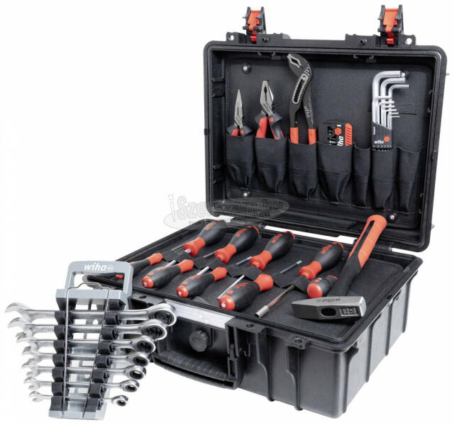 Iparos szerszámkészlet, por- és vízálló hordtáskában, 46 részes, Wiha 45256 Iparos szerszámkészlet, por- és vízálló hordtáskában, 46 részes, Wiha 45256 Kényelmes, robusztus tok kiváló minőségű kéziszerszámok alapfelszereltségével a mobil szerelő számára Hely további szerszámok számára és további tárolóhely kis alkatrészek és gépek számára Az ergonomikus