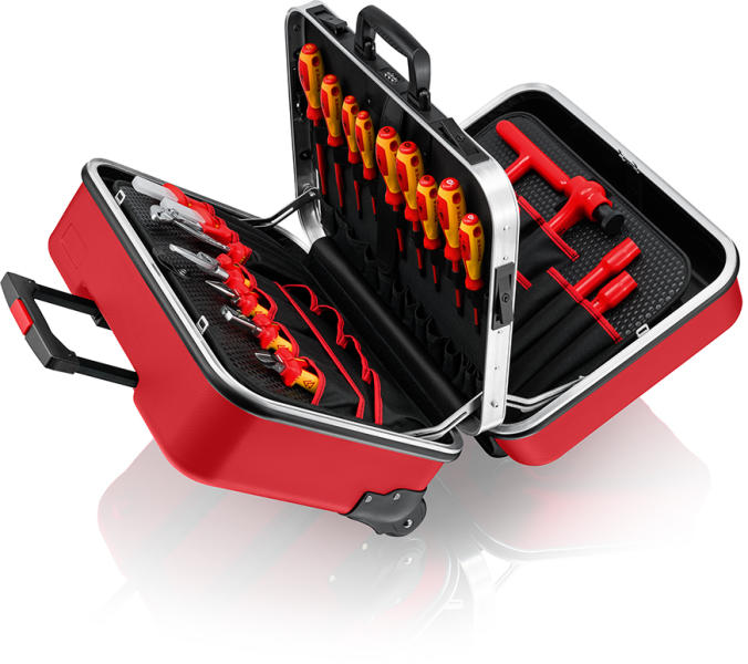 'BIG Twin Move RED'' szerszámláda, villanyszerelői képzettség Strapabíró ABS anyagból készült szerkezet, piros felszerelve egy sor KNIPEX szerszámmal rendszereken való munkavégzéshez, a DIN EN/IEC 60900 szerint tesztelve. Teleszkópos fogantyú az alapban, valamint két külső, gördülékeny kerék. Szabadon áll minden nyitott helyzetben a bepattintható fedéltartóknak köszönh