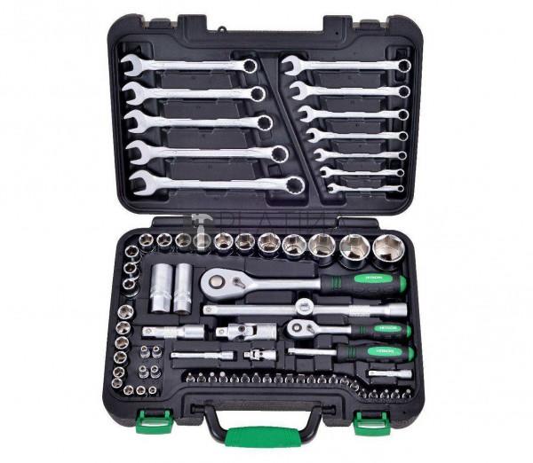 73 darabos szerszámkészlet: 13 db 1/4 dugókulcs: 4,4. 5,5, 5.5, 6,7, 8,9, 10,11, 12,13, 14 mm 1 db 1/4 kézi racsni markolat: zöld/fekete Hitachi felirattal 1 db 1/4 toldószár 1 db 1/4 toldószár 1 db 1/4 univerzális csukló: 50 mm: 75 mm 1 db 1/4 dugókulcs kézi szár: 150 mm zöld/fekete, logóval 7 db 1/4 torx dugókulcs: T8, T10, T15, T20, T25, T27, T30 4 db 1/4 imbusz dugókulcs: H3,