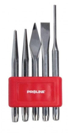 Anyag: króm - vanádium acél, polírozott felület Falra akasztható műanyag szerszámtartó A készlet tartalma: - Pontozó: 120 x 4 mm - Kúpos kiütõ: 120 x 3 mm - Keresztvágó: 130 x 5 mm - Lapos hidegvágó: 130 x 12 mm - Csapszegkiutõ: 150 x 4 mm