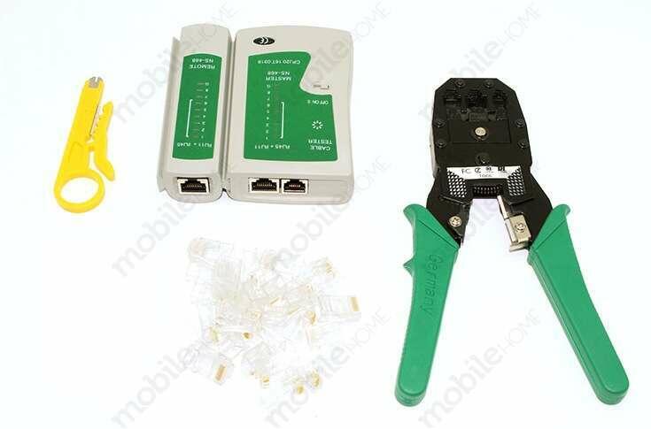 Információk Olyan készlet, amellyel tesztelni és létrehozni lehet az új helyi hálózatot (LAN). A krimpelő eszköz moduláris csatlakozók krimpelésére szolgál. Vágóval, nyitó zárral és oldalsó rögzítő mechanizmussal van felszerelve. A tesztelő ellenőrzi a hálózati kábelek helyességét az RJ45, RJ11 és RJ12 csatlakozókkal. Jelződiódával, kapcsolóval, valamint RJ45