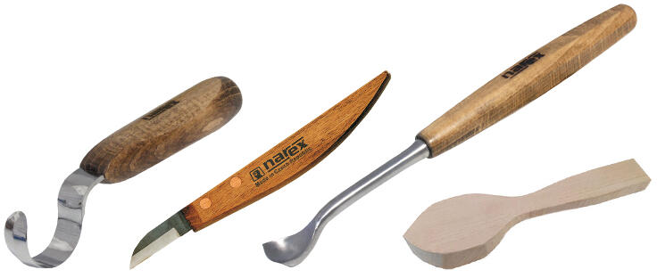 Kanálfaragó kés Mangánacél penge Keménység: 61HRc Lakkozott, kör keresztmetszetű bükkfa nyelezet Fafaragó kés Erősen ötvözött, speciális hőkezeléssel edzett Mn-V acél penge Keménység:62HRc Lakkozott, nyolcszög keresztmetszetű viaszolt bükkfa nyelezet Homorú véső Erősen ötvözött, speciális hőkezeléssel edzett Cr-Si acél szerszámtest Keménység: 59HRc Lakkozott,