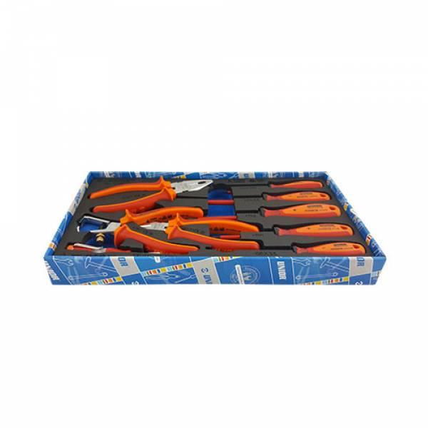 Szigetelt fogó- és csavarhúzó-készlet, SOS tálcában - 964/15SOS Készlet elemeinek száma: 9 Profil(ok): Kódszám Termék Méretek / Mennyiség 621070 964/15SOS 9 406/1VDEBI 180 461/1VDEBI 160 478/1VDEBI 160 603VDETBI 0.4 x 2.5 x 75, 0.6 x 3.5 x 100, 1.0 x 5.5 x 125 613VDETBI PH1 x 80, PH2 x 100 630VDE 0.5 x 3.0 x 140 vl964/15SOS 188 x 364 x 30