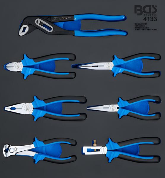 BGS Technic - Germany Mindegyik fogó 2-komponensű puha markolattal Szállítási terjedelem: - Vízpumpafogó, 240 mm - Oldalcsípő, 165 mm - Telefonfogó, hajlított, 200 mm - Kombinált fogó, hossz 175 mm - Telefonfogó, egyenes, 160 mm - Homlokcsípő, 165 mm - Kábelcsupaszító fogó, 150 mm