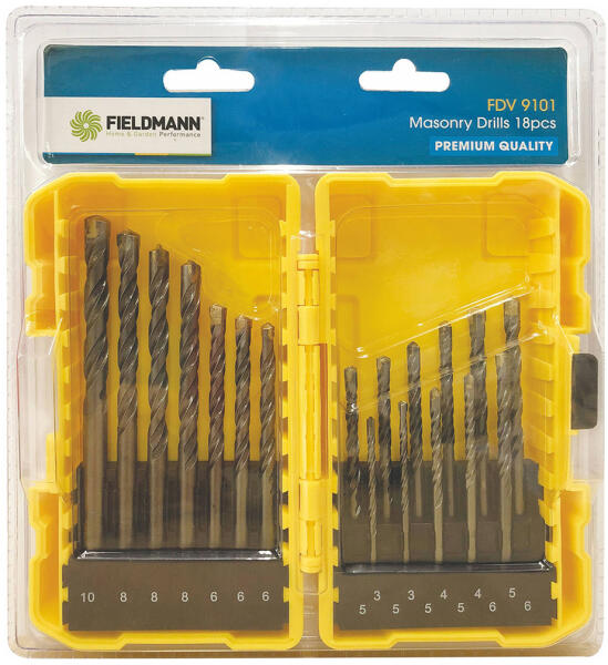 A Fieldmann FDV 9101 prémium minőségű SDS PLUS fúrószár készlet segítségével többféle kemény anyag fúrása lehetséges - csak ne felejtse el megfelelően lehűteni a fúrószárakat. A készlet emellett 6 sima és kereszthornyos csavarokhoz használható bitfejet tartalmaz. A Fieldmann kéziszerszámok gondos tervezés, a gyártási technológia, a minőségi alapanyagok mellet kül