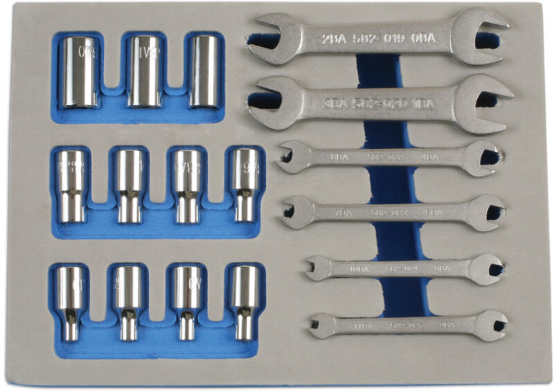 Laser Tools - UK Villás-villáskulcs és dugókulcs készlet angol veteránautókhoz 0BA-tól 11BA méretig. EVA habszivacstálcában szállítva. Tartalma: 6 db villás-villáskulcsok: 0BA x 2BA, 1BA x 3BA, 4BA x 6BA, 5BA x 7BA, 8BA x 10BA, 9BA x 11BA 11 db 1/4" BA dugókulcsok: OBA, 1BA, 2BA, 3BA, 4BA, 5BA, 6BA, 7BA, 8BA, 9BA, 10BA EVA habszivacs tálca Anyaga: Chrome Vanádium Csomagolási mé