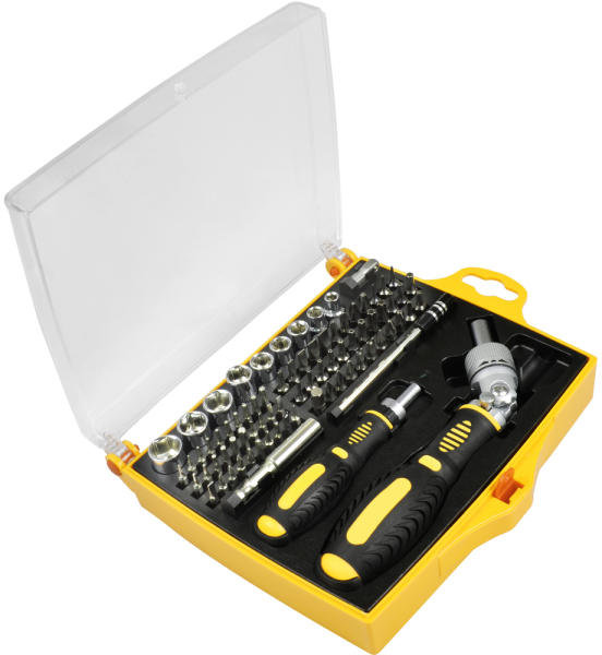 Tulajdonságok: Kifinomult 4 mm-es és 6 mm-es bitkészlet csavarhúzókkal CR-V anyagból, ami nagyobb anyagszilárdságot, így lassabb elhasználódást biztosít. A készlet bitek széles választékát tartalmazza, amelyeket finom órásmunkára, de akár normál méretű csavarokkal történő munkára is használni lehet. Az ergonomikus nyelű és racsnis nagy csavarhúzó alkalmas tartalé