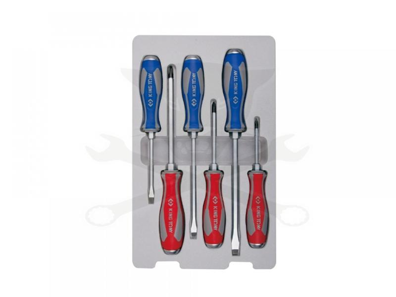 King Tony 6 részes extra erős üthető-végű csavarhúzó készlet Tartalma: - Phillips: Ph1x75; P2x100; P3x150 mm - Lapos: 5,5x100; 6,5x150; 8x175 mm Markolat anyaga: PP + TPR (két komponensű)