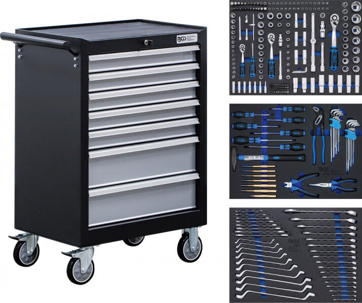Kiváló Minőségű, Műhelykivitel 3 Műhelykocsi-Betéttel 3/3 Robusztus, Kiváló Minőségű Keményhabból (Méretek: 567 X 408 X 32 Mm) Stabil Acéllemez-Szerkezet Porbevonato s Korpusz, Különösen Ellenálló Karcolásokkal Szemben Nagy Teherbírású, Golyóscsapágyazású Görgők, Közülük 2 Rögzíthető Vezetőgörgő Oldalsó Vezetői Fogantyúval A Könnyű Manőverezés Érdek