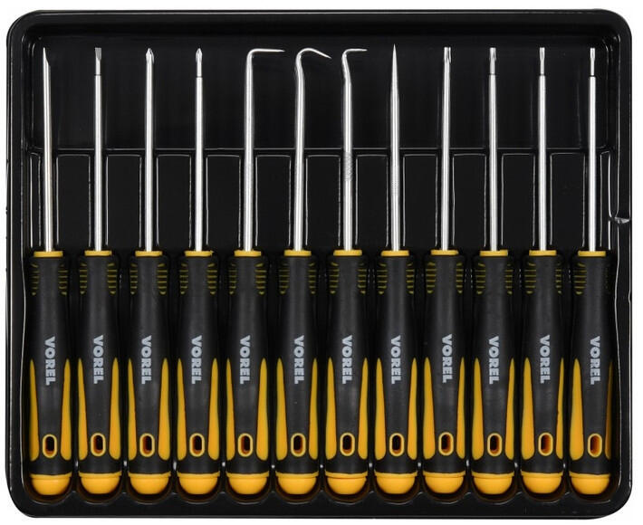 12 darab precíziós csavarhúzóból és horgból álló készlet univerzális használatra CrV króm-vanádium acélból kétkomponensű műanyag fogantyú Készlet tartalma: - lapos: 2,5 - 3,5 mm - PH00, PH0 - T6, T7, T8, T10