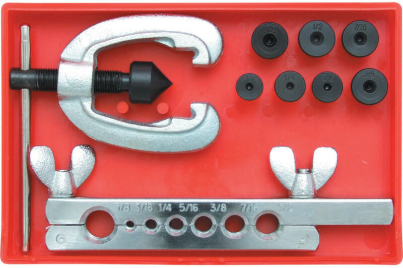 Maximum 1 mm (0.040") falvastagságú puha acél-, alumínium- és rézcsövek dupla peremezéséhez, SAE 45° rendszer szerint. Hőkezelt, köszörült, ötvözött acélból készült forgócsúcs, krómozott a súrlódások csökkentésének érdekében. Hőkezelt, kovácsolt szorítókengyel. Az adapterek feketeoxidáltak és tisztán feliratozottak a könnyebb azonosításért. Egyszerű pere