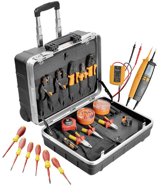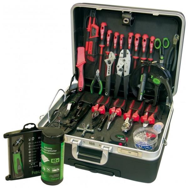 Kemény koffer, ABS -műanyagból, fekete, 2 szerszámtábla, számzárral, dokumentációk részére zsebbel, padlórész variálható válaszfalakkal, hord szíjjal, 38 szerszámmal. Koffer 220023. 38 részes, 470 x 220 x 360 mm Tartalom: VDE csavarhúzókészlet 2K nyéllel PH Kábelkés 1000 V erős pengével 50 mm Ipari tisztítókendők Mérőszalag 3 m PUK zsebfűrész fix markolattal Kábe