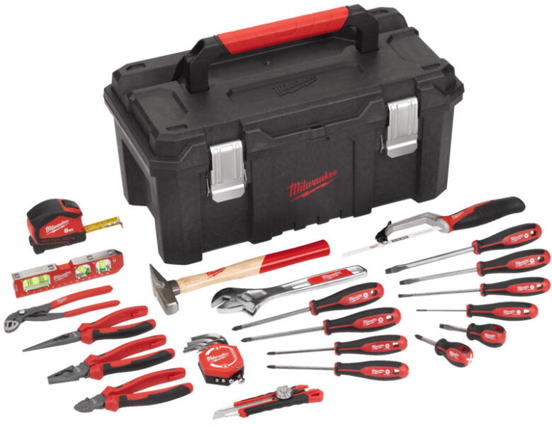 A készlet tartalma: 1x szerszámos láda (4932498480) 1x Billet Torpedo Vízmérték mágneses beállított 45° szögmérős 17 cm (4932459097) 1x Állítható pofájú villáskulcs 250 mm (48227410) 1x Vízpumpa fogó 180 mm (4932492458) 1x Fogó készlet 3 részes (4932492773) 1x Törhető pengés kés 7 szelvényes 18 mm (48221961) 1x Kompakt egykezes kézi fűrészlap-befogó (48220012) 1x M