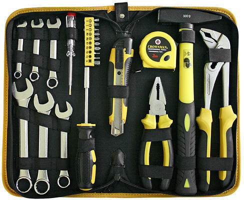 Termékleírás: STR szerszámkészlet 23 db-os - 6 kombinált kulcs 8, 10, 12, 14, 17, 19 mm-es - 1 mérőszalag 3 m x 13 mm - 1 törhető kés - 1 kombinált fogó 180 mm - 1 fogó SIKO 250 mm - 10 bit - fázisceruza - Kalapács, üvegszálas nyél 300 g - csavarhúzó