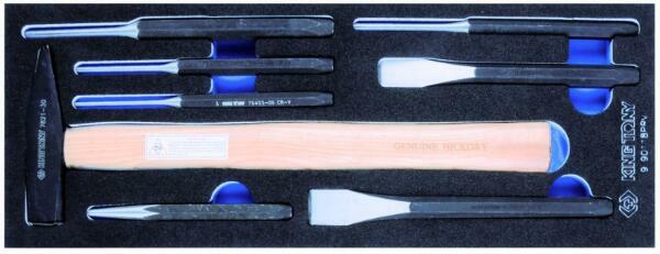 King Tony kalapács, vágó, csapkiütő készlet tartalma 8 db-os speciális King Tony szerszámkészlet autóhoz. Kalapács, vágó, csapkiütő készlet, racsnis hajtókar, csapkiütő. Volkswagen, Mercedes-Benz, Opel, BMW és japán autókhoz 761 racsnis hajtókar: 4 x 120; 762 : 17 x 150 , 20 x 175 764 csapkiütő: 3 x 125 , 4 x 150 , 5 x 165 , 6 x 180 7821-30 kalapács B3 fiók (579x380) EVA
