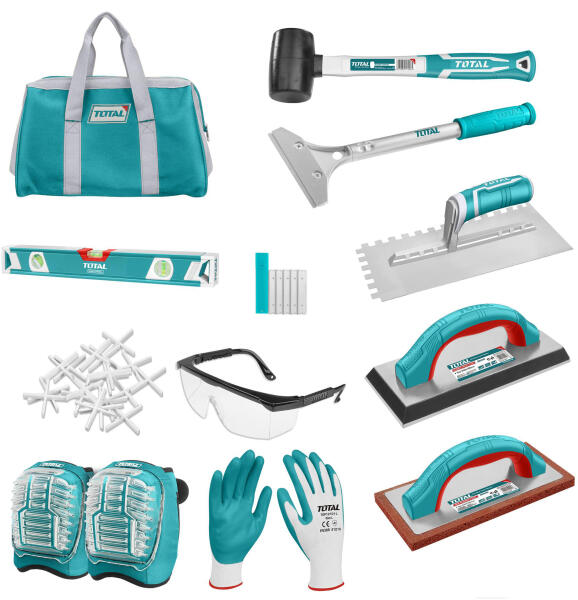 11db burkoló szerszámkészlet (THKTTS1106) Frissítsd fel burkolási munkáidat ezzel a 11 darabból álló szerszámkészlettel! A gumikalapács, fém kaparó, fogazott és finom fugázó gumik, vízmérték, védőszemüveg, nitril kesztyű, térdvédő és csempetávtartók mind segítségedre lesznek az építkezéseken vagy felújítások során. A vászontáska praktikus tárolást biztos