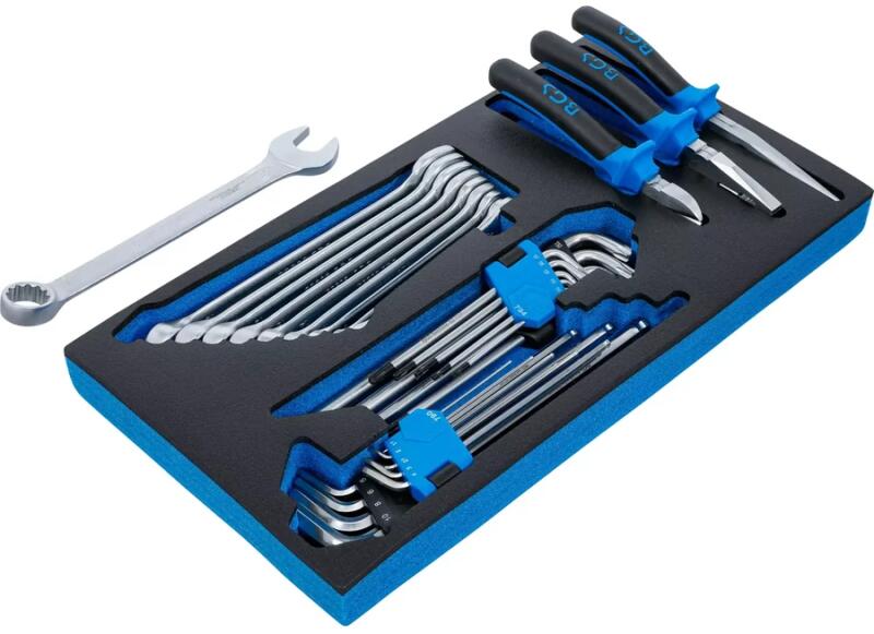 A BGS 2002-hez készült szerszámkészlet szivacs betét. A betét nagy teljesítményű habból készült, amely megvédi a szerszámokat és segít a rend fenntartásában a műhelyben. A készlet különböző kéziszerszámokat tartalmaz, mint például vízpumpa fogó, csavarhúzók, villáskulcsok és egyéb alapvető szerszámok. Specifikáció Betét robusztus, kiváló minőségű kemén