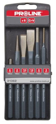 Anyag: króm - vanádium acél Falra akasztható műanyag szerszámtartó A készlet tartalma: - Pontozó: 100 x 6 mm - Kúpos kiütõ: 140 x 2 mm - Hidegvágók: 140 x 10 mm, 150 x 12 mm - Csapszegkiutõk: 150 x 6 mm, 150 x 3 mm
