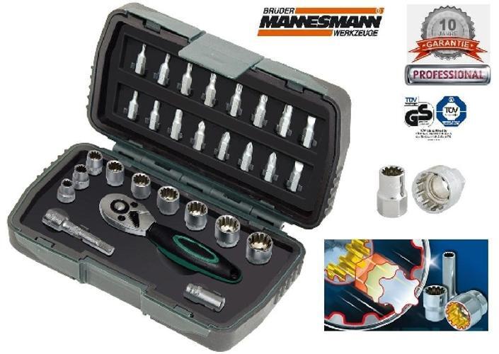 JELLEMZŐK: 10 ÉV GARANCIA TÜV/GS certifikated Német MANNESMANN: abszolút extrém geometriájú dugófej kulcs + BIT készlet. Dugókulcs készlet 1/4" , , Gearlock" A Multi Lock dugókulcs fej kialakítása olyan, hogy alkalmas a klasszikus metrikus és a collos csavarokhoz, E-torx fejekhez, kettős E-torx fejekhez azaz Spline/XZN/VZ, és a szokásos csillagfejű csavarokhoz is. Ez a dugófej