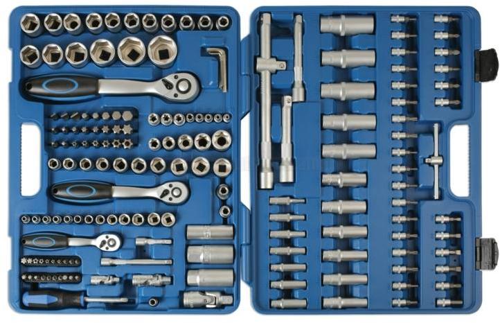 Laser Tools - UK 171 részes szerszámkészlet kék műanyag kofferban Tartalma (1/4 3/8 1/2): - Dugókulcsok 6 lapú hosszú és rövid 1/4" 6 lap normál: 4, 4.5, 5, 5.5, 6, 7, 8, 9, 10, 11, 12, 13, 14 mm 1/4" 6 lap hosszú: 4, 5, 6, 7, 8, 9 , 10 mm 1/4" belső torx: E4, E5, E6, E7, E8 3/8" 6 lap normál: 10, 11, 12, 13, 14, 15, 16, 17, 18, 19 mm 3/8" 6 lap hosszú: 10, 11, 12, 13, 14, 15 mm 3/8