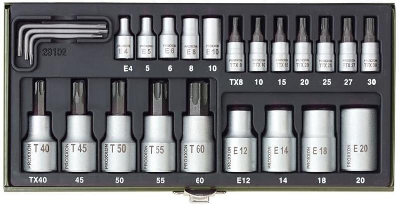 TORX® dugókulcs készlet, speciális 23 részes Műszaki adatok: Anyag: Króm-vanádium acél · Elhajtás: TORX, TORX BO, Külső TORX · Meghajtás: 1/4" (6.3 mm), null · Típus: Dugókulcs bit betét készlet Szállítás tartalma: 6,3 mm (1/4") meghajtású: TORX® belső furatos csavarhúzó betétekhez T BO 8 - T BO 30 · Külső TORX® E 4-től E 8-ig (mindent meghúzó nyomaték 10 Nm)