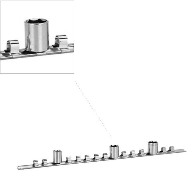 BGS Technic - Germany Krómozott kivitelű fém sín 15 db 3/8"-os dugófej tárolásához. Teljes hossz: 410 mm, tartozék: 15 db klipsz