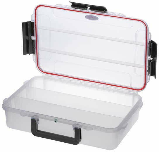 MAX Műanyag doboz, 350x230xH 86mm, IP 67, színes átlátszó, 3 rekesz - belső méretek 316 x 195 x H 81 mm - ellenáll a káros hatásoknak (álló víznek, pornak, ütésnek) - IP 67