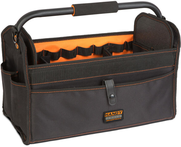 A Handy szerszámos táskák új generációja megérkezett! Merevfalú, fémvázzal rendelkező kivitel, amely extra strapabíró, vastag anyagból készült. A táska áttekinthető beltartalmáról számos tárolózseb és szerszámtartó pánt gondoskodik. A nagy teherbírását, vastag varrásoknak, a szivacsozott fém fogantyúnak és a szegecselt akasztókampónak köszönheti. Nagy befogad