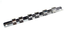 BGS Technic - Germany Krómozott kivitelű fém sín 7 db 1/4"-os dugófej tárolásához. Teljes hossz: 150 mm, tartozék: 7 db klipsz