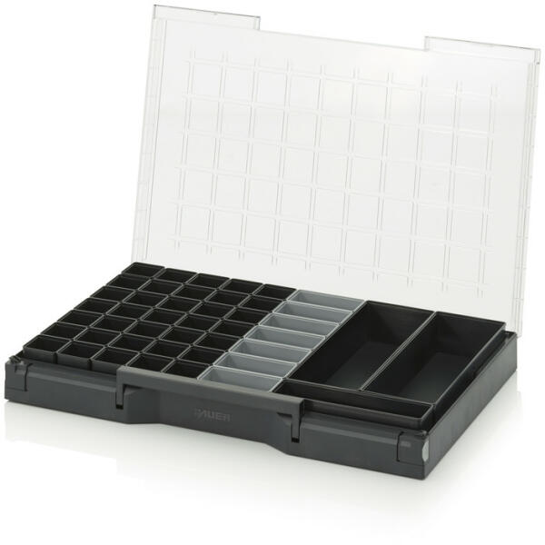 Zárható műanyag rendszerező kis szerszámok és anyagok tárolására. Átlátszó fedél a tartalom gyors áttekintéséhez. Fix rekeszek.