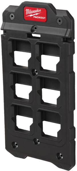 Többféle rögzítési beállítás. Fordítsa a PACKOUT -ot álló tárolóba. 45 kg-os padlóra szerelhető súly. 22 kg fali teherbírás. Csatlakoztatható minden Milwaukee PACKOUT moduláris tárolóhoz. Ütésálló polimer konstrukció.