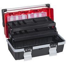 Profi szerszámosláda ellenálló műanyagból két kihúzható polccal. Zárható rendszerező fogyóeszközre a láda fedelében. Alumínium záróklipsszel és fogantyúval. Lakattal zárható.