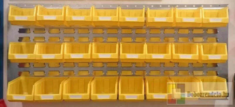 Nagy teherbírású réselt, fém lemez, hátoldalán két függőleges merevítéssel, BULL2 Sárga dobozo... Nagy teherbírású réselt, fém lemez, hátoldalán két függőleges merevítéssel, BULL2 Sárga dobozokkal. A szett tartalmaz: - 1 db horganyzott vízszintes réselt fal - 24 db Bull 2 Sárga doboz mérete (szé x ma): 991x440 mm Falra rögzíthető!