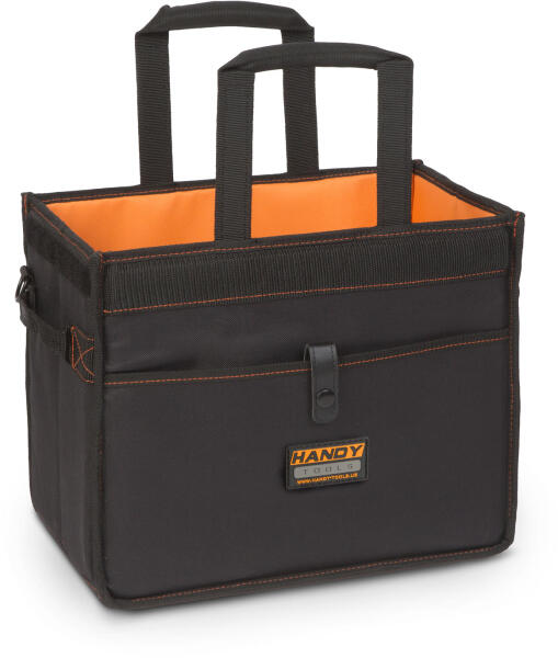 A Handy szerszámos táskák új generációja megérkezett! Merevfalú, tépőzáras tetővel rendelkező kivitel, amely extra strapabíró, vastag anyagból készült. A táska áttekinthető beltartalmáról számos tárolózseb és szerszámtartó pánt gondoskodik. A nagy teherbírását, vastag varrásoknak, dupla oldalfalának és az oldalfalba csúsztatható füleinek köszönheti. Nagy be
