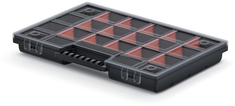- a rekeszek beállításának lehetosége lehetové teszi a méretének és a jelenlegi igények számának beállítását- a rendezo két zárral, egy ergonomikus fogantyúval és egy átlátszó fedéllel van ellátva, így annak tartalma mindig jól látható- a rekeszek maximális száma 36 (18 × 2)