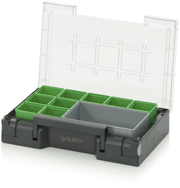 A 2 az 1-ben szervező ergonomikus fogantyúja Könnyen zárható és hordozható egy mozdulattal. A zsanérokat a tok kettős teste védi. Ellenáll zsíroknak, lúgoknak és savaknak.