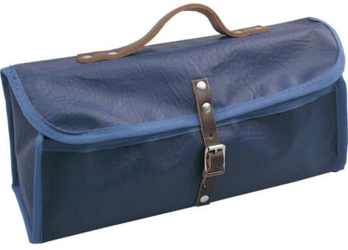 Víz-, szúrás- és rothadásálló PVC táska Szegecselt bőr hordozófül és zárószíj Fém csat Préselt lemez alap és borítólap.