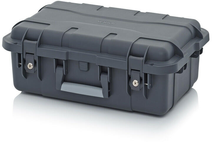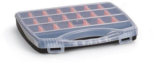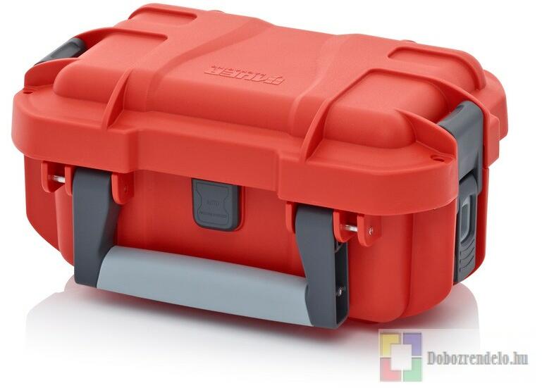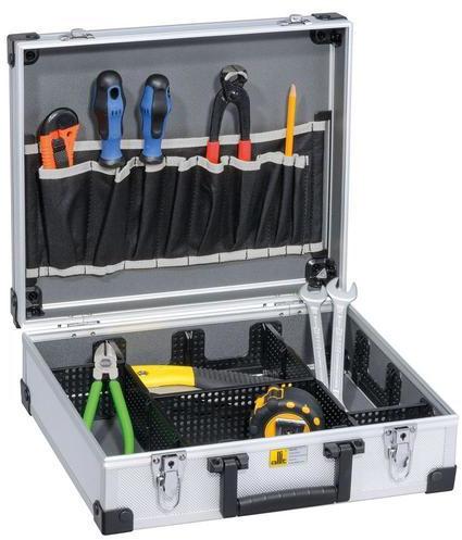 Ellenálló műanyag koffer alumínium kerettel. Elsősorban szerszámokra és szerelőanyagokra. Alakítható műanyag rekeszek és textil zsebek a koffer felső részében. Fémkapcsok segítségével zárható.